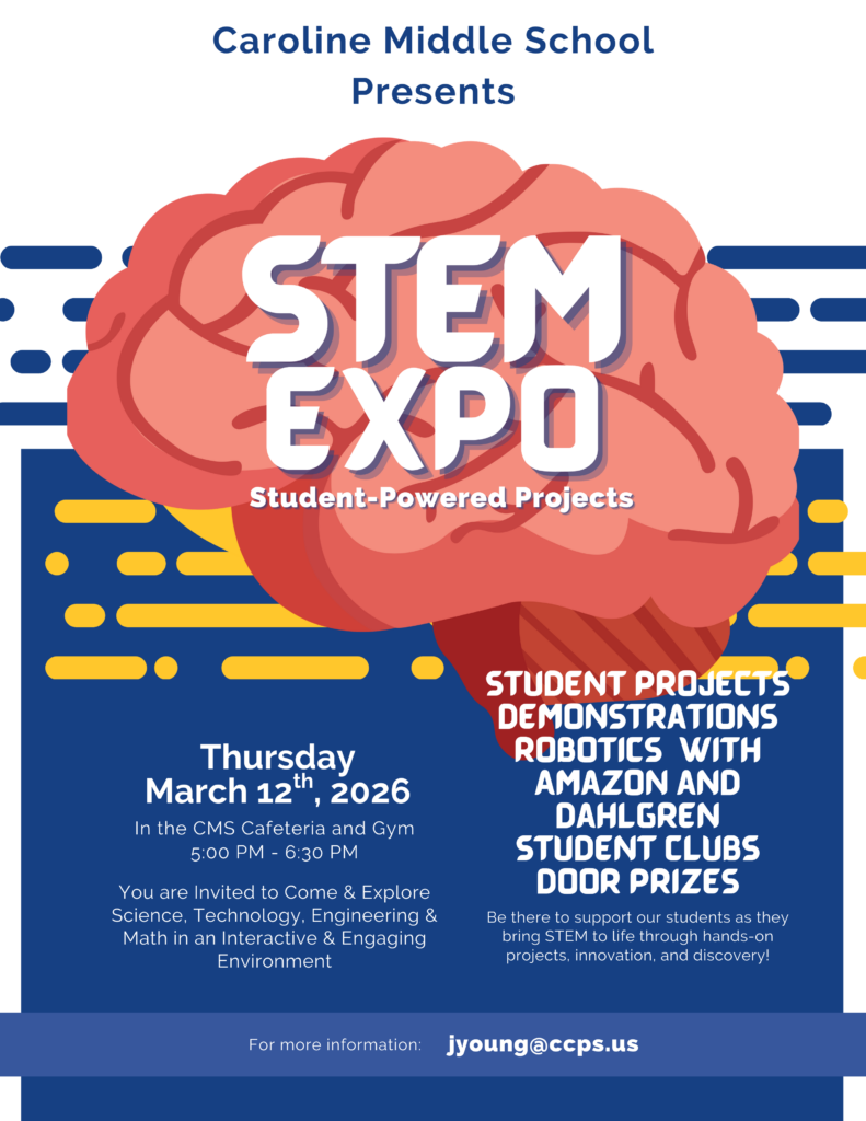 Families, you’re invited to our CMS STEM Expo on Thursday, March 12, 2026, from 5:00–6:30 PM in the CMS cafeteria and gym!
