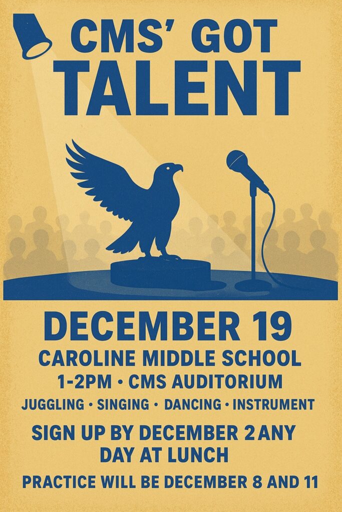 Whether you juggle, sing, dance, play an instrument, or have a totally unique talent, this is your moment to step into the spotlight. Students can sign up at lunch any day through December 2, so don’t wait—grab your friends, your courage, and your best routine! Practice dates will be December 8 and 11, so you’ll have time to polish your act before the big day. Let’s pack the auditorium and cheer on our amazing Eagles!